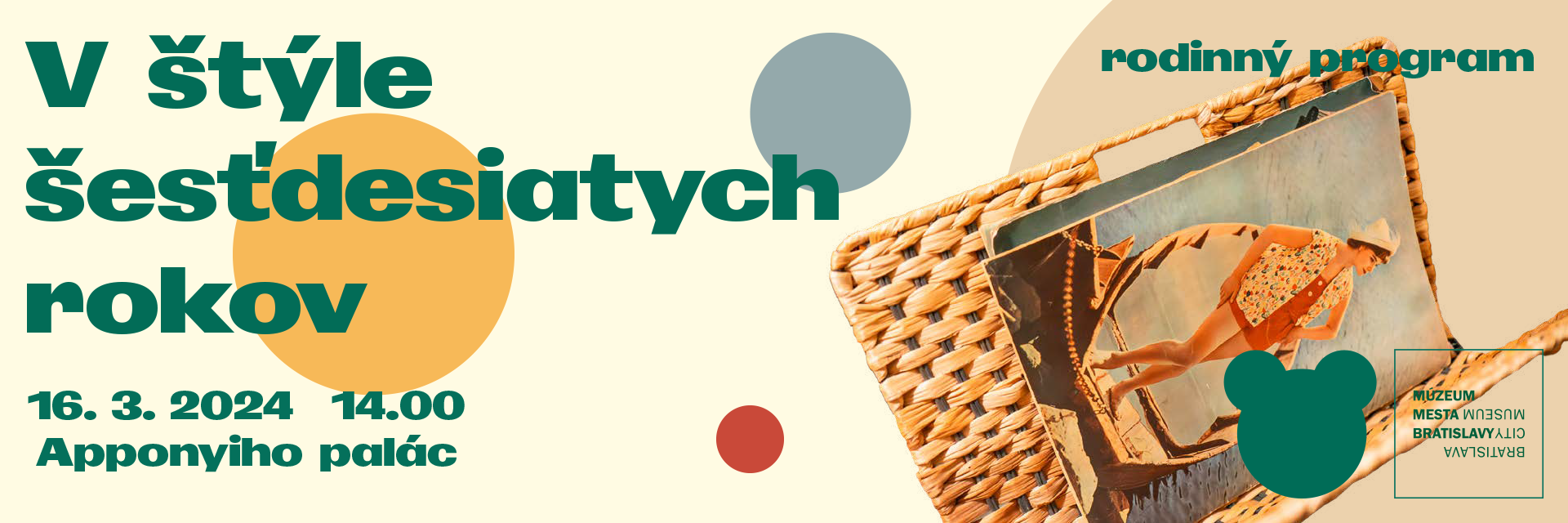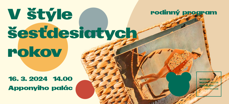 Vstúpte s nami do sveta pestrých šesťdesiatych rokov plných rôznorodých módnych trendov. Preskúmajte, čo sa vtedy nosilo do práce, školy alebo len tak po meste. Počas rodinného programu spoznáte dobové trendy, zdroje inšpirácie ale aj ich nedostatky. Budete mať príležitosť navrhnúť módny doplnok a realizovať svoj vlastný návrh.